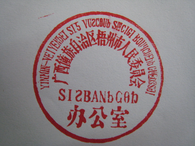 首先印入眼帘的是一枚民国时期用黄铜制成的印章“广西苍梧地方法院印”(见图1),此印沿袭典型民国官印风格:四方、宽边、篆体。时光已过60多年,这枚印章依然保存完好。最引人注目的是“中国人民解放军梧州市军事管制委员会之关防”(见图2)”,关防印是元明清三代以来官印的一个品种,在历代政治、军事、经济、文化等方面有重要的作用。这枚印章见证了梧州市解放之初,政权更替的历史。梧州市军事管制委员会成立于1950年12月1日,是梧州军事管制时期最高权力机关,统一军事、政治、经济、文化等管制事宜。那时的汉字还没有简化,印章中的“国”、“军”、“员”、“会”、“关”仍为繁写,印文三列十五字,疏密有度,印边较宽,字体为老宋体,强调时代变革,通俗易懂为第一要务。“广西省梧州市人民政府印”(图3),为上世纪梧州解放初期使用的一枚宽边方印。1949年11月25日,梧州解放。翌年1月1日,梧州市人民政府成立,行使地方行政权。此印的使用,见证了梧州市人民政府成立的难忘时刻。该印右上角的缺口为停止使用时的刀削口。“梧州市人民抗美援朝业主殷户分会印”(见图4),为一枚椭形印章,见证了1950年梧州人民响应党中央、毛主席的号召,积极参加抗美援朝、保家卫国运动,为国捐资出力的感人历史。“广西省梧州市各界人民代表会议协商委员会”是一枚长方条形印(图5)。1950年1月~1955年8月,协商产生了第一届至第五届梧州市各界人民代表会议协商委员会,代行梧州市人民代表大会的职权。梧州市人民政协的前身为梧州市各界人民代表会议协商委员会。这枚印章见证了这段难忘的历史。“广西僮族自治区梧州市人民委员会办公室”印(见图6),反映了上个世纪五六十年代梧州国家政权机关机构变动的情况。印章为何有“僮族”二字?原来1958年起广西成立了僮族自治区,1965年根据周总理倡议,经国务院批准,把广西僮族自治区改为广西壮族自治区。 1954~1962年,梧州市相继召开了第一至第五届人民代表大会,会议相应选举产生了第一至第五届市人民委员会(下称市人委)。市人委是市人民代表大会的执行机关,是市一级国家执行机关。办公室为它的办事机构。“梧州市革命委员会”印(见图7)见证了“文化大革命”梧州一段动荡的历史。1966年“文化大革命”开始后,全市地方政权机关工作处于瘫痪状态。1967年1月,市人委被群众组织夺了权。之后,先后成立了市、公社等各级革命委员会。市革命委员会于1968年8月26日成立,为梧州市党政合一的政权机构。1980年9月29日,恢复市人民政府,由市长、副市长、秘书长及市政府工作部门正职负责人组成,实行市长负责制。