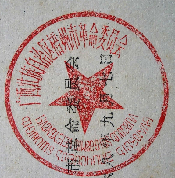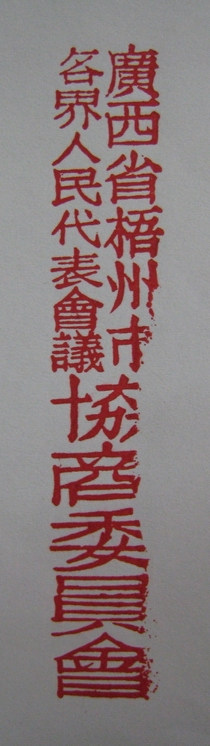 首先印入眼帘的是一枚民国时期用黄铜制成的印章“广西苍梧地方法院印”(见图1),此印沿袭典型民国官印风格:四方、宽边、篆体。时光已过60多年,这枚印章依然保存完好。最引人注目的是“中国人民解放军梧州市军事管制委员会之关防”(见图2)”,关防印是元明清三代以来官印的一个品种,在历代政治、军事、经济、文化等方面有重要的作用。这枚印章见证了梧州市解放之初,政权更替的历史。梧州市军事管制委员会成立于1950年12月1日,是梧州军事管制时期最高权力机关,统一军事、政治、经济、文化等管制事宜。那时的汉字还没有简化,印章中的“国”、“军”、“员”、“会”、“关”仍为繁写,印文三列十五字,疏密有度,印边较宽,字体为老宋体,强调时代变革,通俗易懂为第一要务。“广西省梧州市人民政府印”(图3),为上世纪梧州解放初期使用的一枚宽边方印。1949年11月25日,梧州解放。翌年1月1日,梧州市人民政府成立,行使地方行政权。此印的使用,见证了梧州市人民政府成立的难忘时刻。该印右上角的缺口为停止使用时的刀削口。“梧州市人民抗美援朝业主殷户分会印”(见图4),为一枚椭形印章,见证了1950年梧州人民响应党中央、毛主席的号召,积极参加抗美援朝、保家卫国运动,为国捐资出力的感人历史。“广西省梧州市各界人民代表会议协商委员会”是一枚长方条形印(图5)。1950年1月~1955年8月,协商产生了第一届至第五届梧州市各界人民代表会议协商委员会,代行梧州市人民代表大会的职权。梧州市人民政协的前身为梧州市各界人民代表会议协商委员会。这枚印章见证了这段难忘的历史。“广西僮族自治区梧州市人民委员会办公室”印(见图6),反映了上个世纪五六十年代梧州国家政权机关机构变动的情况。印章为何有“僮族”二字?原来1958年起广西成立了僮族自治区,1965年根据周总理倡议,经国务院批准,把广西僮族自治区改为广西壮族自治区。 1954~1962年,梧州市相继召开了第一至第五届人民代表大会,会议相应选举产生了第一至第五届市人民委员会(下称市人委)。市人委是市人民代表大会的执行机关,是市一级国家执行机关。办公室为它的办事机构。“梧州市革命委员会”印(见图7)见证了“文化大革命”梧州一段动荡的历史。1966年“文化大革命”开始后,全市地方政权机关工作处于瘫痪状态。1967年1月,市人委被群众组织夺了权。之后,先后成立了市、公社等各级革命委员会。市革命委员会于1968年8月26日成立,为梧州市党政合一的政权机构。1980年9月29日,恢复市人民政府,由市长、副市长、秘书长及市政府工作部门正职负责人组成,实行市长负责制。